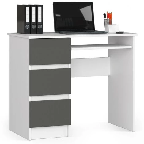 Bureau informatique gauche, bureau d’ ordinateur, 90 cm, A-6, mat, équipé d’une tablette coulissante pour clavier Systeme sans poignée Blanc / Gris Graphite 1 étagères 3 tiroirs 1