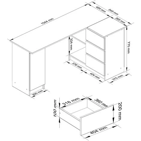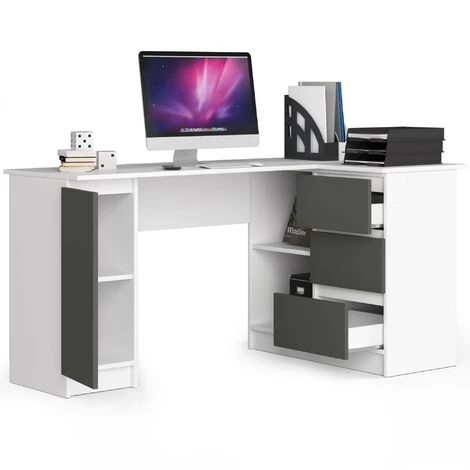 Grand bureau d’angle B20 est un meuble parfait pour tous ceux qui recherchent un lieu de travail fonctionnel pour le travail et les loisirs. Comme son nom le suggère le bureau s’intégrera parfaitement dans tous les coins d’un bureau, d’une chambre d’adolescent ou d’un studio. Le bureau dispose de 3 tiroirs qui coulissent sur des guides à rouleaux métalliques. Les tiroirs ont également un système de blocage à extension complète, ce qui les empêche de tomber. Juste à côté des tiroirs, il y a un renfoncement avec une étagère au milieu. C’est un endroit parfait pour les classeurs, brochures et fournitures de bureau. Si nécessaire, l’étagère du milieu est amovible, ce qui crée de l’espace supplémentaire. Le bureau a également un rangement fermé par une porte de l’autre côté. Derrière la porte, il y a une étagère au milieu, tout comme de l’autre côté.