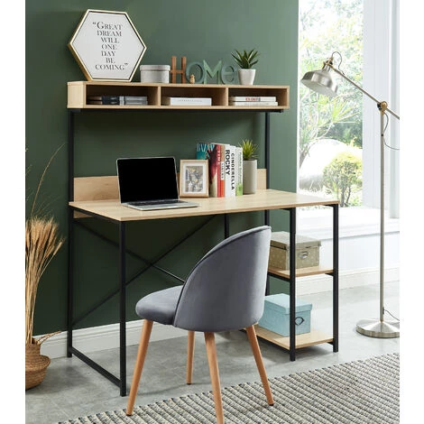 Le bureau MOLLY est plus que complet en vous proposant un vaste espace de travail composé de deux étagères basses ainsi que trois niches supérieures. Vous aurez définitivement tout à proximité ! Sa ligne légère grâce à sa structure en métal noir et en bois clair trouvera sa place autant dans une chambre qu’un salon.
