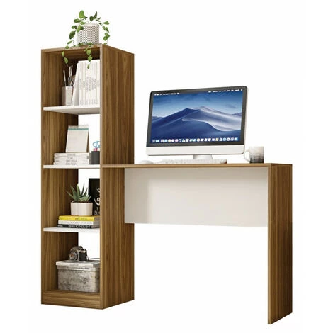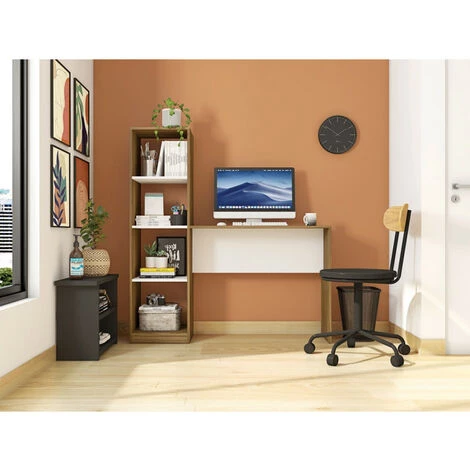 Ensemble Bureau 90 cm et Rayonnage Intégré. Coloris Blanc et Imitation Chêne.