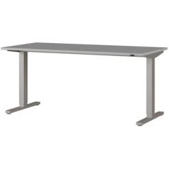 Bureau réglable en hauteur électriquement avec deux pieds en T, plateau de table (chargeable jusqu’à 80 kg) en couleur gris clair, cadre en métal thermolaqué en noir, avec câble d’alimentation, fiche et unité de commande pour monter et descendre le plateau en continu (de 72 à 120 cm), revêtement de résine mélamine, chants ABS. Taille de l’article (L x H x P) : 160 x 73 à 120 x 80 cmCouleur : Gris clair/Argenté Matières : aggloméré / revêtement de résine de mélamine / métalPoids de l’article : 49.24 KG