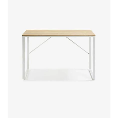 Bureau avec plateau rectangulaire en panneaux MDF avec finition effet bois naturel et pieds en acier blanc. Structure avec pieds en acier peint. Dimensions : longueur 120 x profondeur 60 x hauteur 76 cm Hauteur du pied du plateau au sol: 72 cmÉpaisseur du plateau: 15 mm Matériaux : MDF E0 (Panneau de fibres à densité moyenne à faible émission de formaldéhyde classé E0), AcierColoris : Naturel, blanc Poids du produit : 15 KG