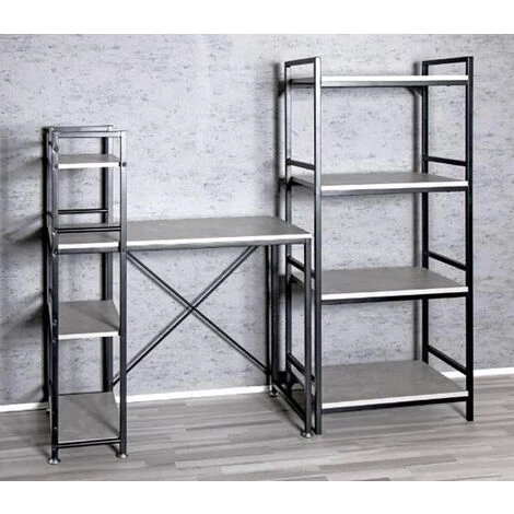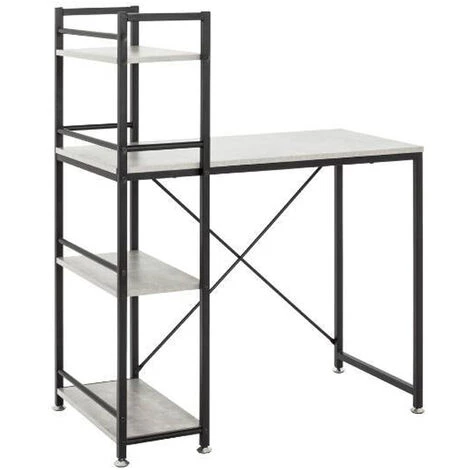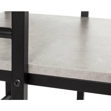 Bureau combiné en tube d’acier laqué noir avec étagère integrée avec 3 étages en MDF décor optique béton (mélamine). Pratique et offre plusieurs possibilité de rangement pour les accessoires bureau. Dimensions : L90 x P52 x H114 cm. Hauteur de bureau : 75 cm. Matière : acier et MDF. Couleur : noir-optique béton. Poids : 15 kg