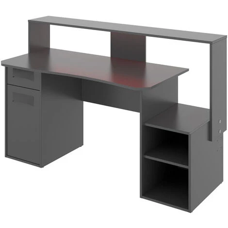 Bureau Gaming en panneau de particule mélaminé coloris graphiteAvec un tiroir peut être monté des deux côtés1 porte et 1 nicheBande LED RVB avec contrôleur sans fil qui vous permet de : allumer ou éteindre les lumières et régler l’intensitéPlusieurs couleurs et diverses transitions automatiques réglables en vitesse et en intensité.Livré en kitDimensions : Longueur 153,5 x Profondeur 62-68.5 x Hauteur 84.2-97 cmCouleur : graphite Matière : panneau de particule mélaminéPoids : 50 kg