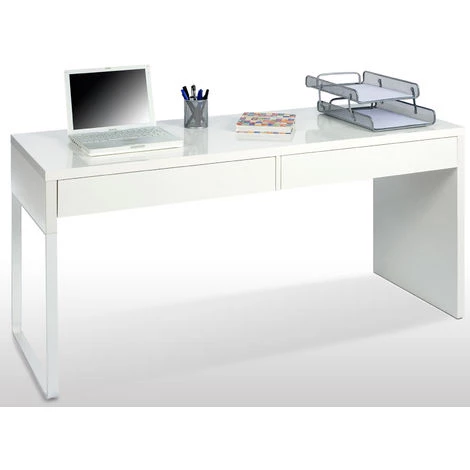 Bureau réversible en blanc brillant, 2 tiroirs avec glissières métalliques. Fait de panneaux de particules avec un revêtement en mélamine. Les pieds métalliques peuvent être positionnés soit à droite soit à gauche de la table, selon vos besoins. Son design simple permet de l’intégrer comme une table d’ordinateur ou d’un bureau. Dimensions : L 138 x H 75 x P 50 cmColoris : blanc brillantMatière : bois mélaminé, métal Poids : 15 kg