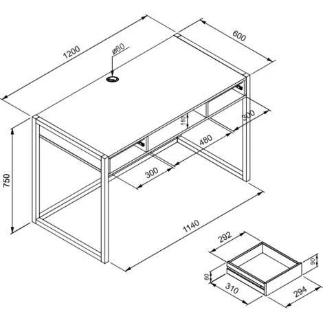 - Trou de Ø 6 cm sur le dessus du bureau pour cacher les câbles