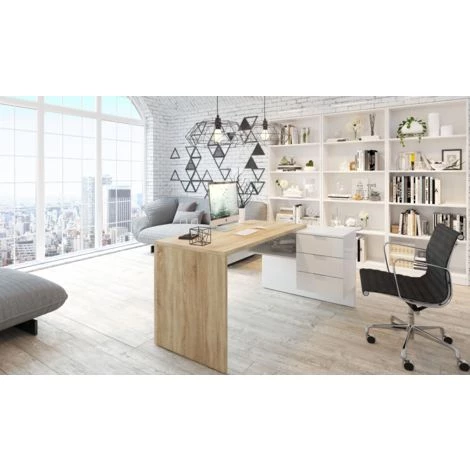 Scrivania da ufficio 145×108 cm Bianco opaco e Rovere Canadese con tre cassetti