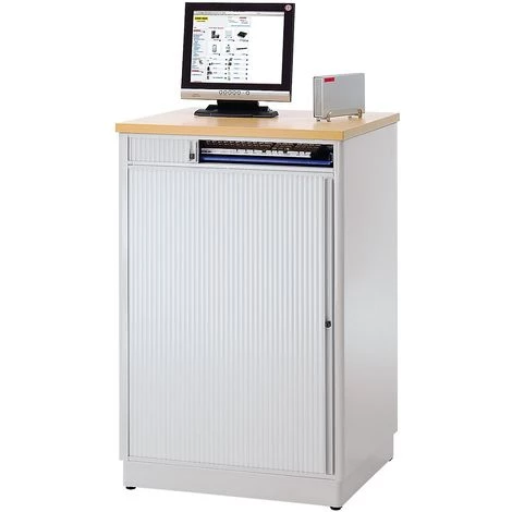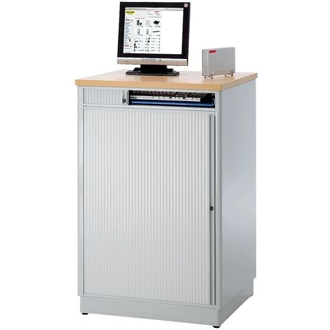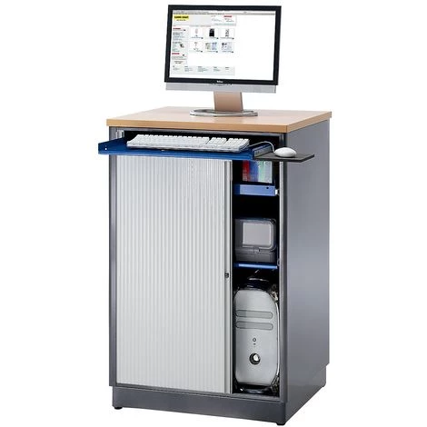 Construction robuste en tôle d’acier peinte époxy. Plateau façon hêtre, épaisseur 25 mm, avec passage pour câbles. Fermeture peu encombrante par rideau.Tirette pour clavier avec tablette pour souris extractible à droite ou à gauche. Rideau séparé.Eléments coulissant sur glissières à 100% de leur profondeur, charge max. 35 kg. Passages pour câbles pratiques.Eléments bleu gentiane RAL 5010. Rideaux verrouillables.