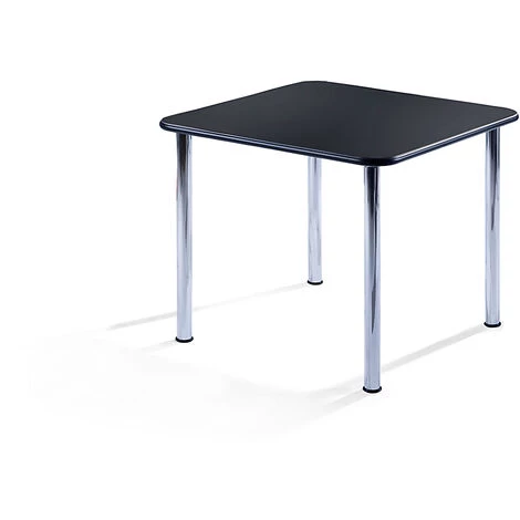 Largeur: 900 mm, Hauteur: 720 mm, longueur: 900 mm, Épaisseur panneau: 22 mm, Prix échelonné à partir de: 1 pièces, Forme: Carré, Modèle de piétement: Piétement 4 pieds, Coloris piétement: Chrome, Matériau du piétement: Tube acier, chromé, Coloris plateau: Noir, Prix par: Pièce