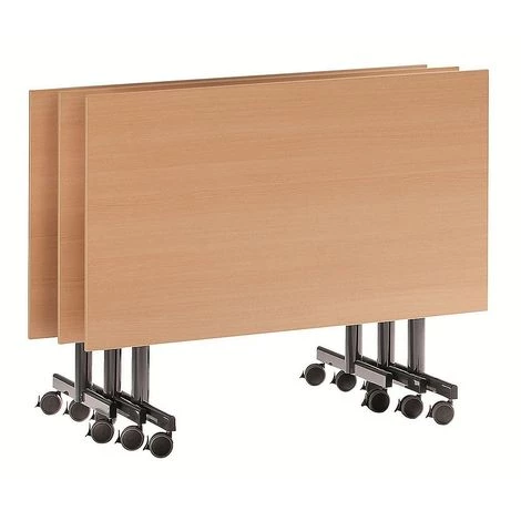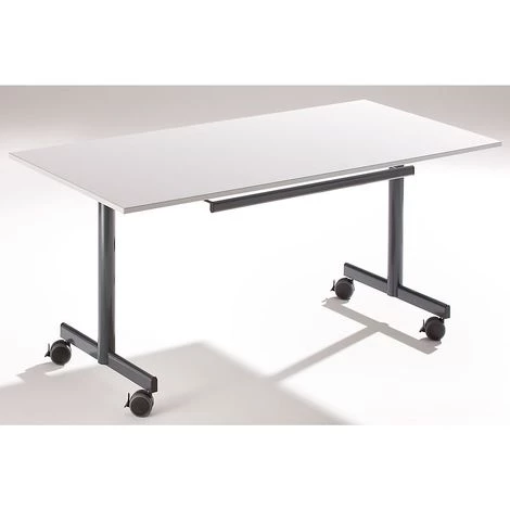 Une mobilité et une flexibilité parfaites grâce aux grandes roulettes pivotantes avec dispositif de blocage et plateau rabattable. Plateau épaisseur 19 mm avec protection des chants en PVC de 3 mm. Piétement en tube rond, Ø 60 mm, peint époxy anthracite.Le mécanisme de rabattement du plateau permet le stockage de plusieurs tables dans peu d’espace, car celles-ci peuvent être emboîtées les unes dans les autres.Cinq tables n’occupent que 1,2 m de profondeur.Blocage du plateau en position déployée aussi bien que rabattue.Hauteur x profondeur h.t. 720 x 800 mm.