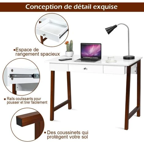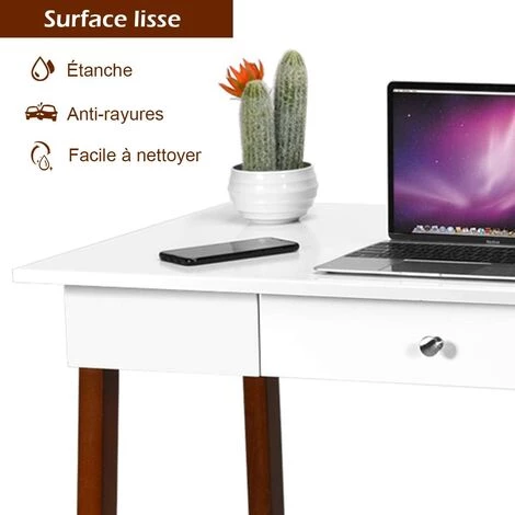 Notre bureau multifonctionnel améliore vos conditions de travail et de vie. Le posséder est votre meilleur choix. Notre bureau a un dessus en panneau MDF blanc avec des pieds en bois d’hévéa. Le matériau est durable et peut vous accompagner longtemps. En même temps, la structure est solide. Un bureau spacieux et un grand tiroir vous offrent un espace de rangement suffisant.