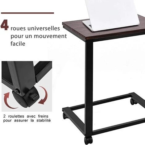 【Conception des freins】Deux desquatre roulettes de cette table de lit à roulettes pour PC sont équipées defreins, ce qui vous permet de stabiliser cette table et de vous améliorer autravail.