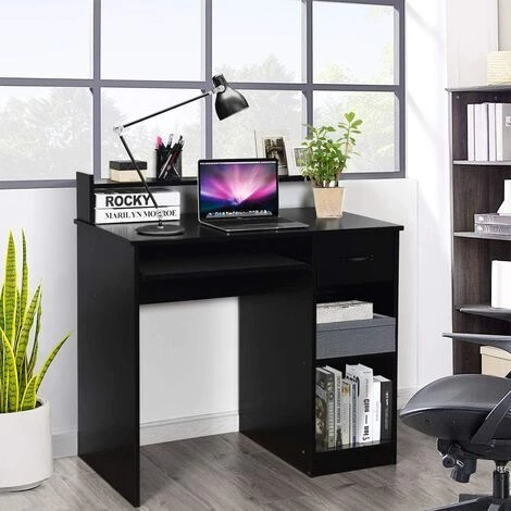 Si vous avez besoin d’un bureau pour étudier ou travailler, cette table d’ordinateur en panneaux de particules de style général est idéale pour vous. Elle se caractérise par un design compact, mais elle laisse également de la place pour tous les outils dont vous avez besoin pour mener à bien vos tâches et vos projets. La surface de cette table d’ordinateur est noire et lisse, avec deux étagères, ce qui permet de placer des livres ou des plantes. Sous la table se trouve un support coulissant pour clavier que vous pouvez utiliser pour y placer un clavier et une souris.
