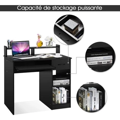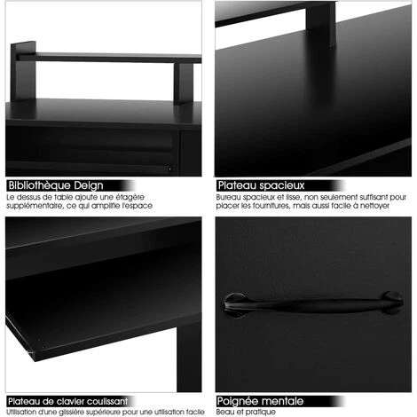 - 【Un design unique avec beaucoup d’espace de rangement】: Notre bureau est équipé d’un plateau de bureau ouvert, d’un support de clavier, d’un tiroir coulissant et de deux grandes étagères. Il offre un espace pratique pour la papeterie, les livres et certains objets personnels. La tour central de l’ordinateur peut être placée sur une étagère si le stratifié du milieu n’est pas installé.
