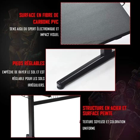 - 【Bureau spacieux pour un espace de jeu suffisant :】La surface de 115 cm (L) x 60 cm (L) de large de la table est suffisamment spacieuse pour vos moniteurs de jeu, clavier de jeu et autres équipements de jeu, spécialement conçus pour votre meilleure expérience de jeu. La surface en fibre de carbone PVC le rend confortable au toucher et facile à nettoyer.