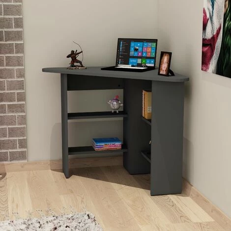 Seredic est un bureau moderne et fonctionnel ! C est la solution idéale pour rendre le travail plus confortable. Grâce à son design, il est idéal pour la maison et le bureau. Ce bureau d angle peu encombrant est le meuble idéal pour travailler dans un petit appartement. Malgré sa petite surface de travail, ce bureau offre suffisamment d espace sur son support pour votre ordinateur portable et les autres éléments que vous utilisez dans votre bureau à domicile. Avec un tiroir et un support, vous disposez d un espace pour vos petits objets et vos documents, ce qui vous permet de vous concentrer sur votre travail créatif. Ce bureau séduit également par son design chic et minimaliste. Matériau : Mélaminé Dimension : 80 x 80 x 73,8 cm (L x P x H) Couleur : Anthracite