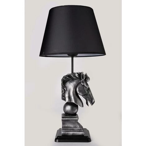 Il s agit d une lampe de table attrayante avec un pied de lampe original en forme de tête de cheval sur sphère. La lampe à poser Replica, en métal argenté et tissu noir mat, présente un design surprenant et indéniablement élégant et une simplicité fascinante. Fabriquée à partir de matériaux durables, elle constitue un atout décoratif original et en même temps discrètement élégant comme éclairage d ambiance ou de surface.