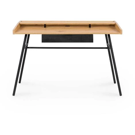 Le bureau industriel GASPARD est un meuble de caractère qui joue sur un mélange efficace entre le bois couleur chêne et noir, le tout posé sur les pieds fins légèrement évasés en métal noir.