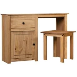 Le meuble de chambre à coucher est en bois de pin massif, ce qui le rend robuste, stable et durable. Le bois massif se caractérise par de beaux grains qui donnent aux meubles une touche de style naturel. En outre, la table de maquillage comporte un tiroir et une porte pour garder les produits cosmétiques organisés et à portée de main.