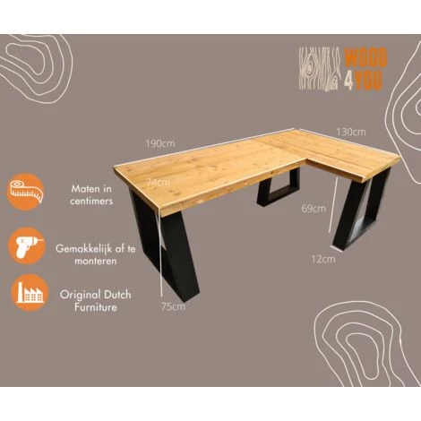 Bureau d’angle en bois torréfié robuste et pratique aux dimensions extérieures 190/130x74cm, adapté à la salle de travail et d’étude mais aussi à la chambre des enfants. Le bureau a une hauteur de 75 cm et l’espace sous le bureau au sol est de 69 cm. Le bureau est en bois torréfié et possède une base en épicéa peinte en noir. Parce que vous recevez 2 bureaux séparés, vous pouvez créer vous-même l’arrangement souhaité !