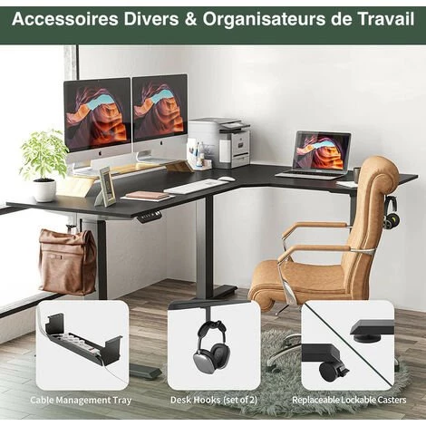 - 【Espace de Travail Spacieux】- Grande taille de 160 cm long et 120 cm largeur en forme L est idéal pour le travail et la vie quotidienne. Le cadre acier de qualité industrielle associé à un plateau solide permet une capacité de charge de 150 kg pour soutenir votre grand espace de travail idéal. Il comprend un boîte de câble, 2 crochets. En plus nous vous donnons 6 roulettes pivotantes à 360 degrés avec fonction de freinage, ce qui permet de faire pivoter pour se fixer sous les pieds du bureau.