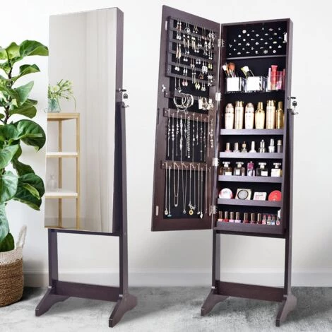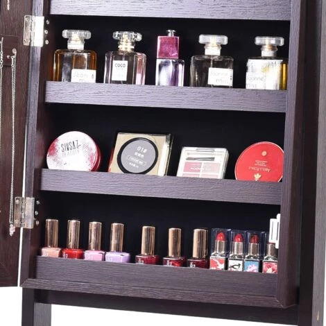 5. Large storage space The jewelry cabinet has 3 transparent compartments specially designed for makeup brushes and cosmetics, 6 rows of storage shelves, and there is enough space to store rings and cosmetics.Specifications: