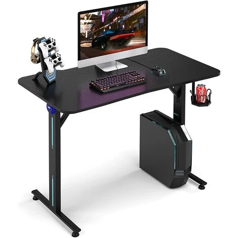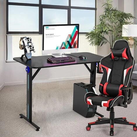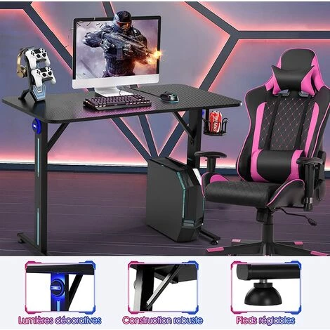 GOPLUS Bureau De Jeu Ergonomique Avec Porte-Gobelet Et Support De Manette, Bureau De Jeu Gaming Avec Lumière, Table De Jeu Pour PC Informatique En Fibre De Carbone, 110×59,5×76,5CM,Noir