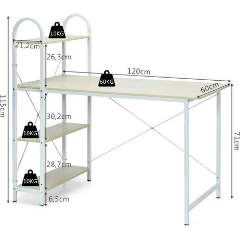 - Poids supporté maximum : bureau 60 kg, étagère 10 kg