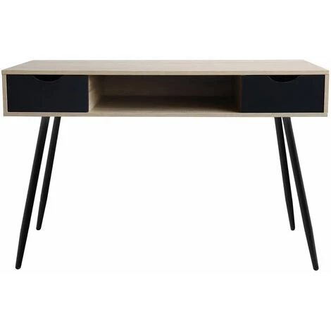 Choisissez ce bureau scandinave BJORN fabriqué en bois naturel pour constituer votre espace de travail personnel chez vous et qui s’adapte aisément à la déco de votre pièce. Facile à monter, il comporte un caisson conçu en bois d’une couleur naturelle qui laisse un espace ouvert au milieu pour un rangement supplémentaire aux deux tiroirs qui se situent sur les côtés. Les quatre pieds en métal noir lui assurent une bonne stabilité. Son design géométrique, ses lignes épurées et son design minimaliste font de ce bureau scandinave un meuble qui s’intègre parfaitement à tous les intérieurs, quel qu’en soit le style. Que ce soit pour le télétravail, des activités manuelles ou pour vos loisirs, ce bureau de style nordique en bois et métal est idéal pour aménager un coin bureau avec un effet déco tendance.