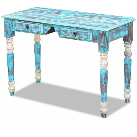 Ce bureau en bois au style vintage, fait en bois de récupération massif, sera un supplément indémodable pour votre maison. Le dessus offre une surface stable et robuste pour que vous puissiez y poser vos verres, un panier de fruits, un vase ou d’autres objets décoratifs. Il est doté de deux tiroirs qui vous offrent assez d’espace pour y ranger des petits objets comme des clés, des carnets et d’autres babioles. Ce bureau peut être utilisé comme buffet, table console, bureau d’ordinateur, table de travail, table pour lire ou étudier, etc. Le bureau est fait en bois de récupération, ce qui signifie que chaque meuble est unique et légèrement différent l’un de l’autre. Les meubles faits en bois de récupération possèdent les caractéristiques de bois différents comme le bois de teck, d’acacia, de manguier, de saal, etc. Le bois de récupération est solide, stable, durable et magnifique. Les signes d’usure et la structure de fibres visible donnent à chaque meuble une apparence unique et leur propre histoire. Ce bureau est entièrement fait à la main et la qualité de l’artisanat s’ajoute à son style rétro spectaculaire. Chaque étape du processus est effectuée avec le plus grand soin, qu’il s’agisse de la recombinaison, le polissage, la peinture ou le cirage. Remarque importante : Les couleurs varient d’un meuble à l’autre, rendant chacun de nos bureaux unique, la livraison est aléatoire.