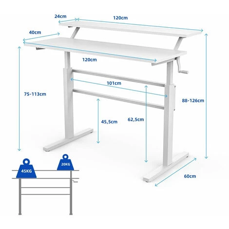 Présentation produit: Bureau assis debout réglable en hauteur 75-113cm avec manivelle pliable mabuel table d’ordinateur egonomique blanc