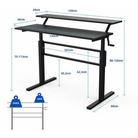 Présentation produit: Bureau assis debout réglable en hauteur 75-113cm avec manivelle pliable mabuel table d’ordinateur egonomique noir