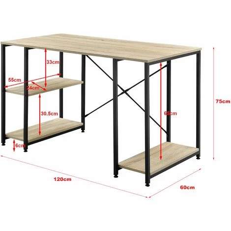 Présentation produit: Bureau avec étagères table poste de travail panneau de particules mélaminé et acier revêtu par poudre 75 x 120 x 60 cm chêne et noir