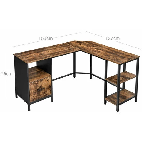 Présentation produit: Bureau d’angle table en forme de l avec caisson à dossiers suspendus 2 étagères bureau à domicile montage facile cadre en acier style industriel marron rustique et noir