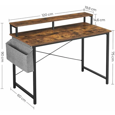 Présentation produit: bureau informatique table d’étude avec avec support écran sac de rangement en tissu barres en x pieds réglables 120 x 60 x 90 cm style industriel marron rustique et noir