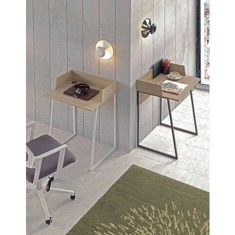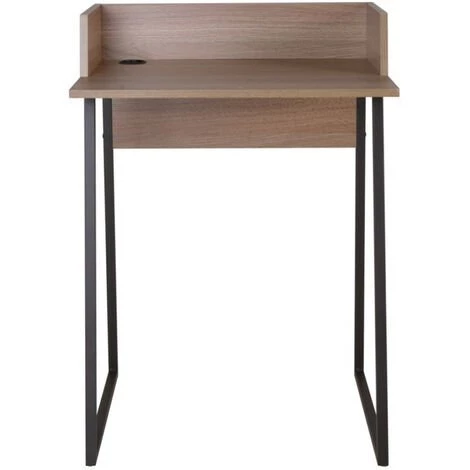 Bureau fonctionnel de lignes simples et fluides de style scandinave en mélamine noyer avec les pieds métalliques laqués en marron foncé. Il a un orifice pour passer les câbles de la tablette, de l’ordinateur… Ce bureau est idéel pour les espaces réduits et il y a d’espace suffisant pour travailler ou étudier qui donne une touche d’élégance et de simplicité à la maison.