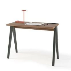 Bureau fonctionnel et minimaliste en mélamine avec les pieds en hêtre laqués et une tablette décoratif pour les stylos. Il y a nombreux de combinaisons de couleurs possibles. La simplicité et la grandeur du plateau le font le bureau parfait pour créer une zone étudiée ou un espace de travail confortable et sobre.