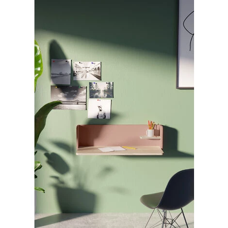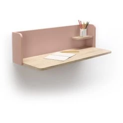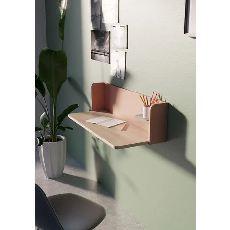 Bureau mural de conception minimaliste et fonctionnel fabriqué en mélamine avec les bords arrondis. Le bureau a une petite étagère pour y mettre matérial de travail ou quelque objet décoratif. Ce bureau est parfait pour les petits espaces et peut être installé aussi comme console dans l’entrée de la maison.