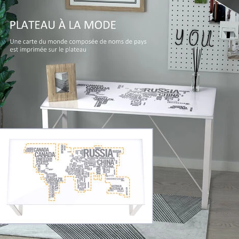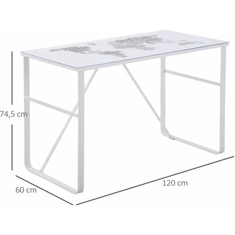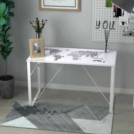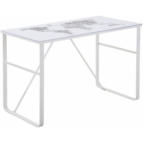 Si vous recherchez un bureau adapté à votre espace de travail, ce joli bureau avec plateau verre trempé décor mappemonde lettres est un choix idéal pour vous. Son design épuré et la qualité de ses matériaux (verre trempé, métal) sublimeront votre intérieur. Caractéristiques : – Design contemporain épuré mélant avec élégance le verre (plateau décor mappemonde lettres) et le métal pour sublimer votre intérieur – Grand plateau dim. 120L x 60l cm fournissant un bel espace de travail – Fabriqué en métal de haute qualité et en verre trempé épais pour un usage pérenne – Pieds de nivellement antidérapants : stabilité optimale, aucun risque de rayure de votre sol – Montage facile, rapide à l’aide du manuel d’assemblage illustré fourni Spécifications : – Couleurs : blanc, noir – Matériaux principaux : verre trempé, métal – Dim. totales : 120L x 60l x 74,5H cm – Dim. plateau : 120L x 60l cm – Épaisseur verre trempé : 6 mm – Charge max. recommandée : 80 Kg – Livraison effectuée en un colis – Réf. : 836-442V01WT