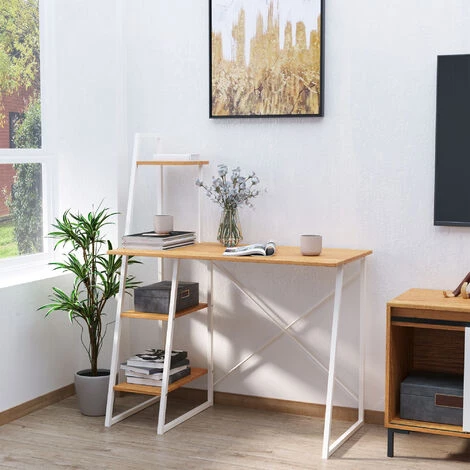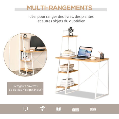 HOMCOM Bureau Informatique Design Industriel Avec Bibliothèque Trapézoïdale 3 étagères Panneaux Particules Aspect Bois Clair Métal Blanc