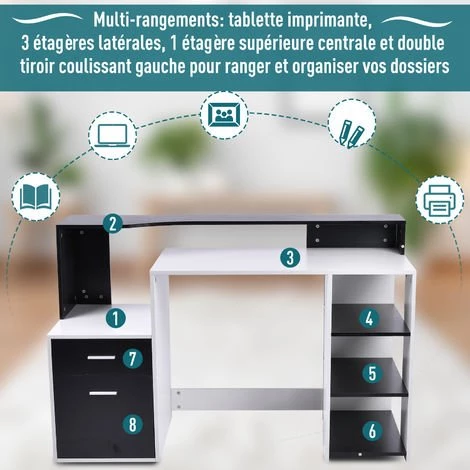 – Multi-rangements : tablette imprimante, 3 étagères latérales, 1 étagère supérieure centrale et double tiroir coulissant gauche pour ranger et organiser vos dossiers