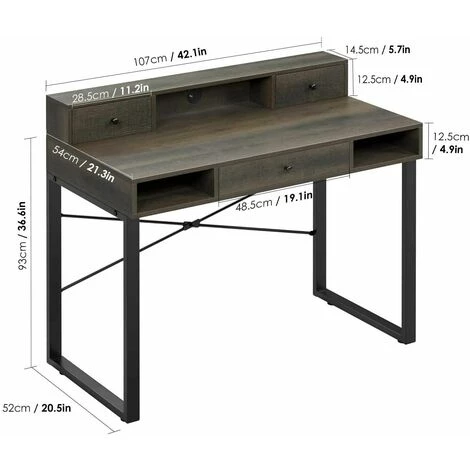 ★Bureau spacieux : La taille du bureau disponible est de 107 x 39,5 cm. Il y a suffisamment d’espace pour les ordinateurs, claviers, souris, livres, cahiers, etc. Il y a 1 étagère avec 2 tiroirs et 1 compartiment. Vous pouvez utiliser des lampes de bureau, des plantes vertes, des stylos, des autocollants, du ruban adhésif, etc. La largeur réelle de la table est de 54 cm. Très agréable.