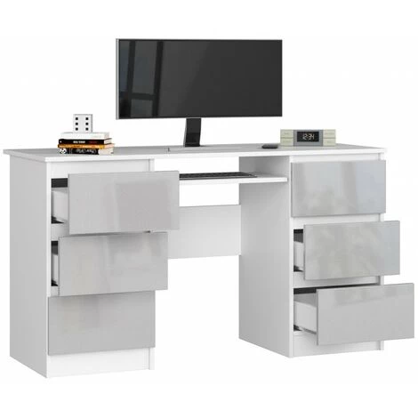 Le bureau présenté dispose de 6 tiroirs de grande capacité et est réalisé en matériaux résistants à l’abrasion, grâce auxquels il ne perd pas son aspect esthétique, même s’il est fréquemment utilisé. En outre, tous les bords sont protégés contre les dommages mécaniques causés, par exemple, par un choc contre une chaise, grâce aux bordures en ABS. Grâce à cela, le bureau peut servir son propriétaire pendant longtemps. Corps blanc, façade gris métal