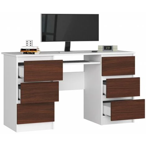 Le bureau présenté dispose de 6 tiroirs de grande capacité et est réalisé en matériaux résistants à l’abrasion, grâce auxquels il ne perd pas son aspect esthétique, même s’il est fréquemment utilisé. En outre, tous les bords sont protégés contre les dommages mécaniques causés, par exemple, par un choc contre une chaise, grâce aux bordures en ABS. Grâce à cela, le bureau peut servir son propriétaire pendant longtemps. Corps blanc, façades wengé