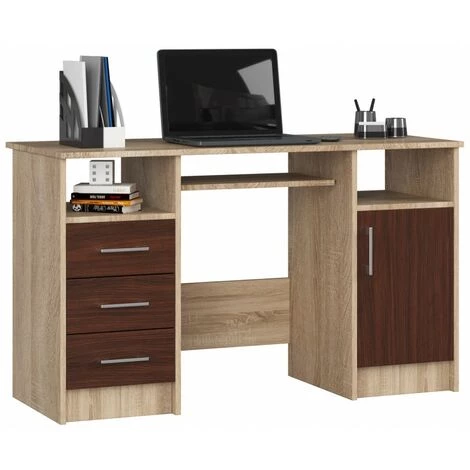 Le bureau est doté d’une tablette coulissante pour clavier, de trois tiroirs pratiques et de portes avec façades en panneaux stratifiés. Le meuble est fait en panneau stratifié résistant à l’abrasion. Le plateau, les côtés et les façades sont dotés de chants en ABS. Corps sonoma, façades wengé.
