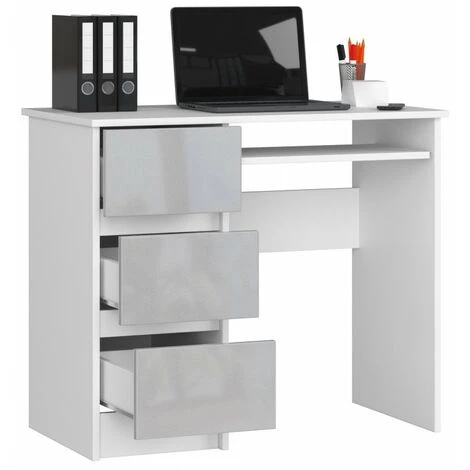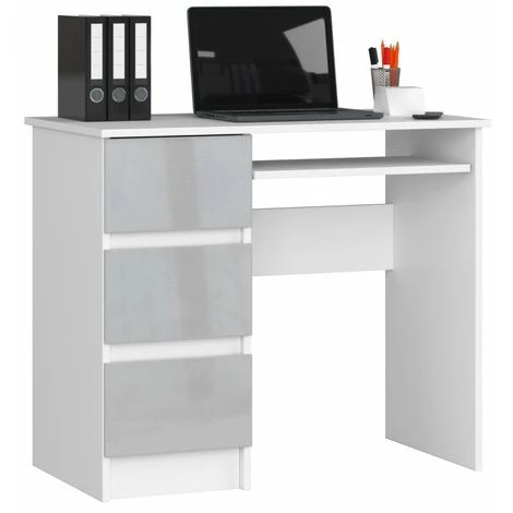 Le bureau est doté de trois tiroirs qui vous offrent un grand espace libre pour ranger et garder à portée de main les objets et documents importants. Le déplacement des tiroirs et de la tablette à clavier est possible grâce aux glissières à rouleaux métalliques. Le matériau de base est le panneau stratifié. Grâce à sa haute qualité, il rend le mobilier résistant à l’abrasion. Les bords visibles du meuble sont protégés contre les dommages par des bordures en ABS. Corps blanc, façade gris métal