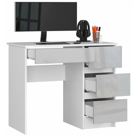 Le bureau est doté de quatre tiroirs qui vous offrent un grand espace libre pour ranger et garder à portée de main les objets et documents importants. Le déplacement des tiroirs est possible grâce aux glissières à rouleaux métalliques. Le matériau de base est le panneau stratifié. Grâce à sa haute qualité, il rend le mobilier résistant à l’abrasion. Les bords visibles du meuble sont protégés contre les dommages par des bordures en ABS. Corps blanc, façade gris métal