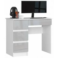 Le bureau est doté de quatre tiroirs qui vous offrent un grand espace libre pour ranger et garder à portée de main les objets et documents importants. Le déplacement des tiroirs est possible grâce aux glissières à rouleaux métalliques. Le matériau de base est le panneau stratifié. Grâce à sa haute qualité, il rend le mobilier résistant à l’abrasion. Les bords visibles du meuble sont protégés contre les dommages par des bordures en ABS. Corps blanc, façade gris métal