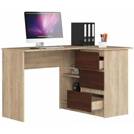 Avec ses trois tiroirs et ses tablettes pratiques, ce meuble offre beaucoup d’espace Ă amĂ©nager. Conçu comme un bureau d’angle, il est extrĂŞmement utile dans de petits espaces, et les tiroirs ajoutent de l’Ă©lĂ©gance et du style Ă l’ensemble du design. La profondeur du bureau convient aussi bien aux propriĂ©taires d’ordinateurs portables que d’ordinateurs de bureau avec un moniteur dĂ©diĂ©. Corps sonoma, façades wengĂ©