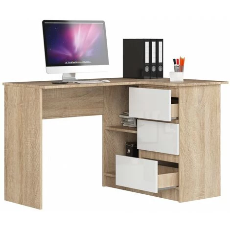 Avec ses trois tiroirs et ses tablettes pratiques, ce meuble offre beaucoup d’espace à aménager. Conçu comme un bureau d’angle, il est extrêmement utile dans de petits espaces, et les tiroirs ajoutent de l’élégance et du style à l’ensemble du design. La profondeur du bureau convient aussi bien aux propriétaires d’ordinateurs portables que d’ordinateurs de bureau avec un moniteur dédié. Corps sonoma, façades blanches.